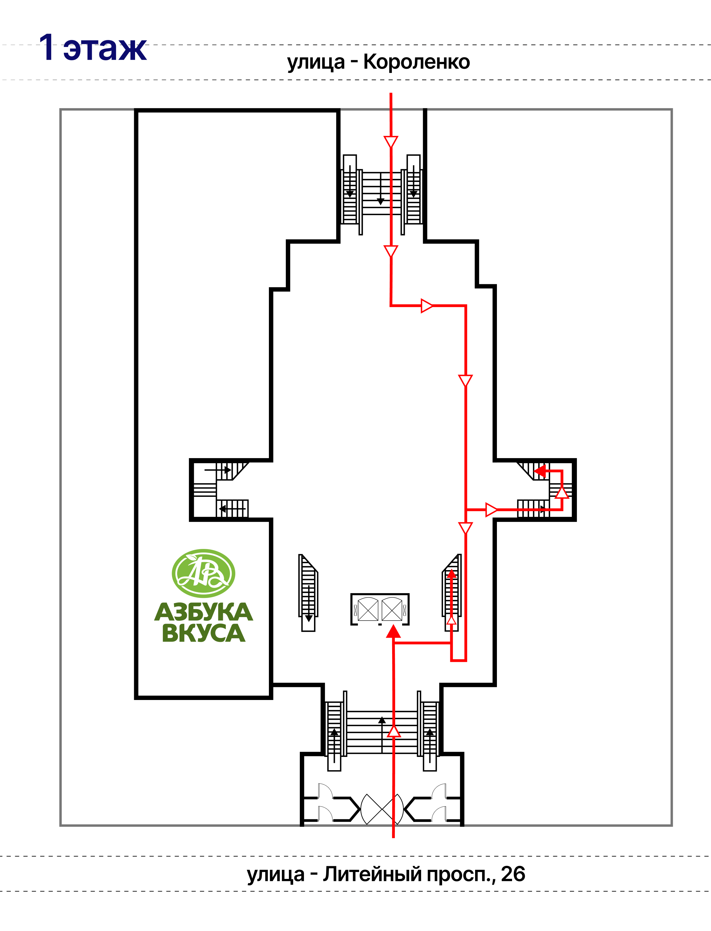 Вход в бизнес центр с двух сторон (Литейный пр., ул. Короленко). Офис находится на втором этаже. Расположение на этаже указано ниже.